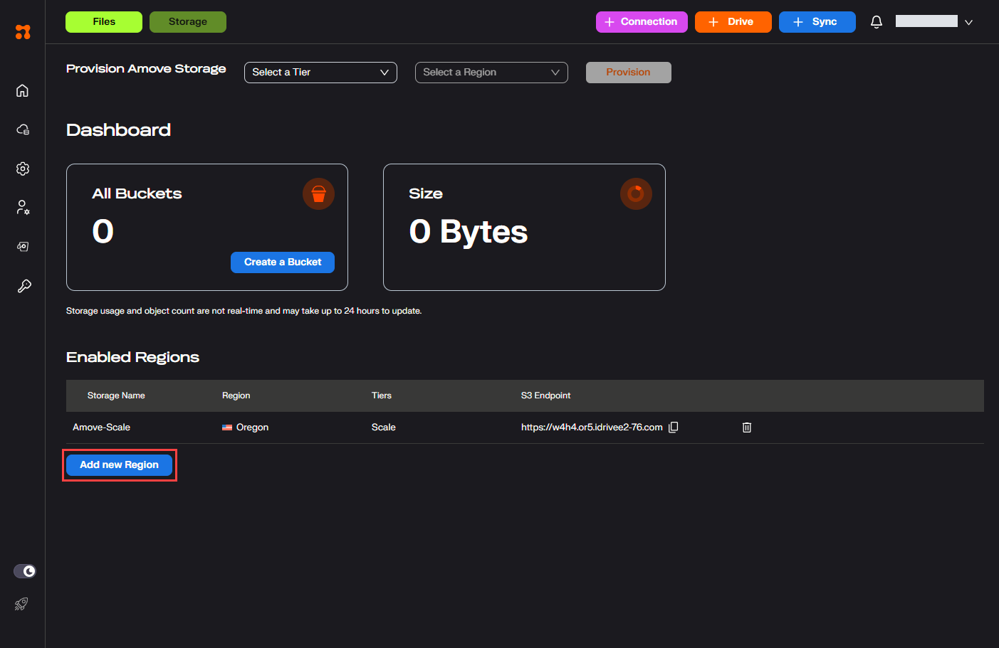 The list of enabled regions for each storage type, along with their corresponding S3 endpoint, is displayed under the **Enabled Regions** section. Users can copy the endpoint or delete a region as needed.