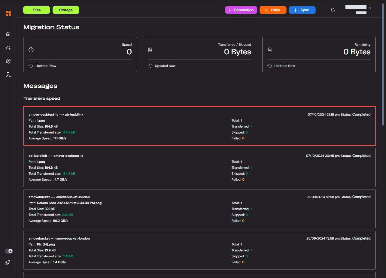 In the Transfer Status page, users can track ongoing and completed transfers: